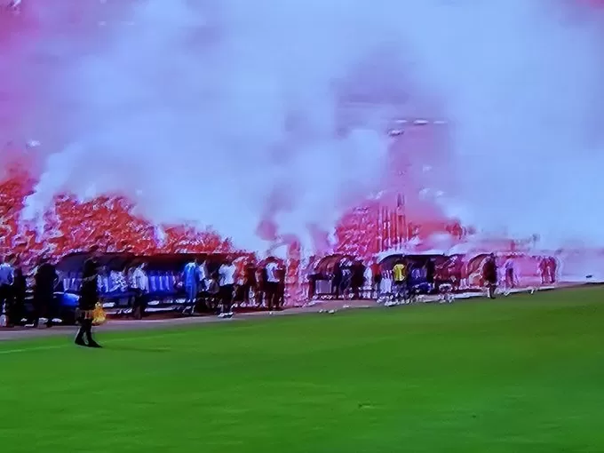 وتوقفت المباراة لمدة 15 دقيقة، في ظل انعدام الرؤية داخل الملعب، قبل أن تستأنف لدقائق قليلة قبل اندلاع الاشتباكات.