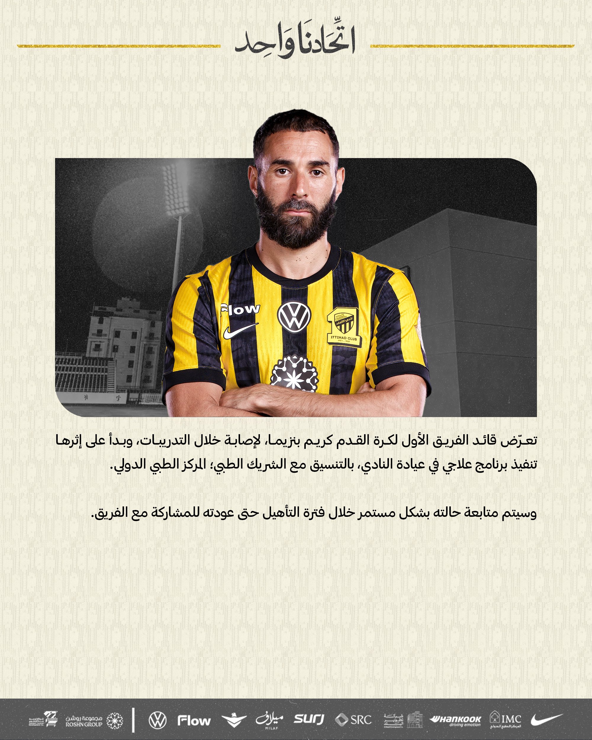 وقال بيان النادي: “تعرض قائد الفريق الأول لكرة القدم كريم بنزيما لإصابة خلال التدريبات، وبدأ على إثرها تنفيذ برنامج علاجي في عيادة النادي.”
