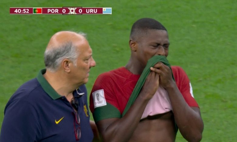 أصيب نونو مينديز لاعب المنتخب البرتغالي، خلال المباراة أمام أوروجواي، الجارية حاليا بينهما في بطولة كأس العالم.