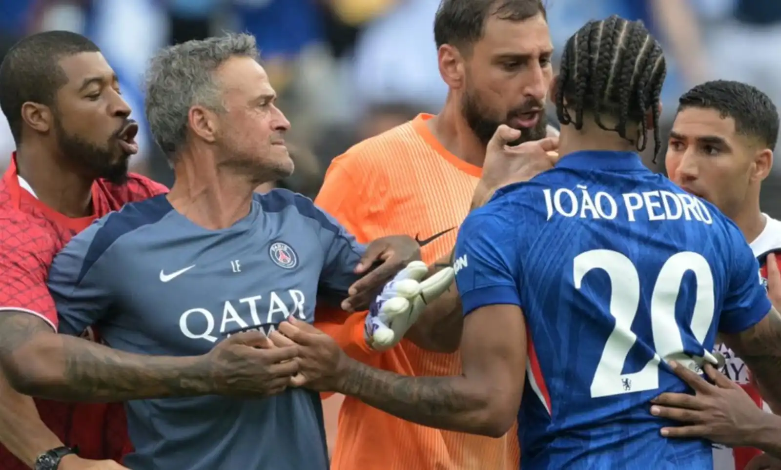 اندلع شجار عنيف بين لاعبي باريس سان جيرمان وتشيلسي عقب نهاية اللقاء، بدأ بتدخل من حارس باريس جانلويجي دوناروما تجاه أحد لاعبي البلوز، وتحديدًا جواو بيدرو، ليتصاعد الموقف سريعًا وسط إشارات من أشرف حكيمي توحي بأن بيدرو “يتحدث كثيرًا”، ما دفع المدرب لويس إنريكي إلى التدخل بنفسه.