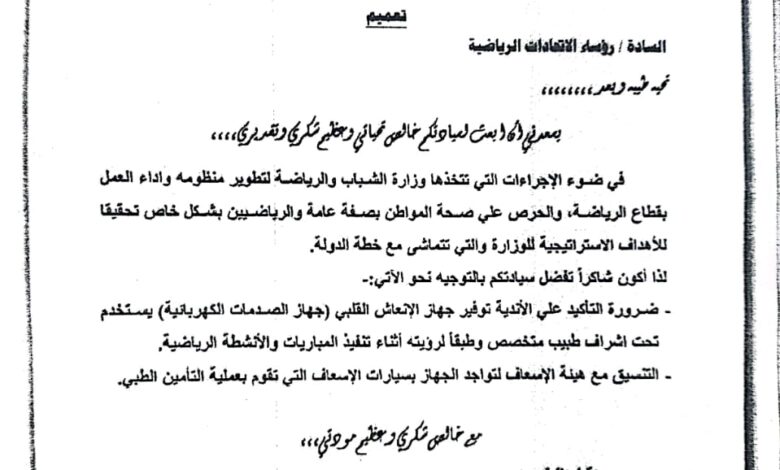 القاهرة في 10 فبراير /أ ش أ/ أخطر الاتحاد المصري لكرة اليد برئاسة خالد فتحي، الأندية بضرورة توفير جهاز صدمات القلب أو إنعاش القلب في المباريات وفقا لتعليمات الرعاية الصحية من قبل وزارة الشباب والرياضة، فضلا عن تجهيز سيارة الإسعاف من قبل الفريق صاحب
