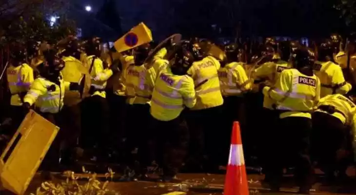 وأضافت الشرطة في بيانها: واجه الضباط أعمال عنف استمرت على مدار 90 دقيقة وأصيب أربعة ضباط خلالها.