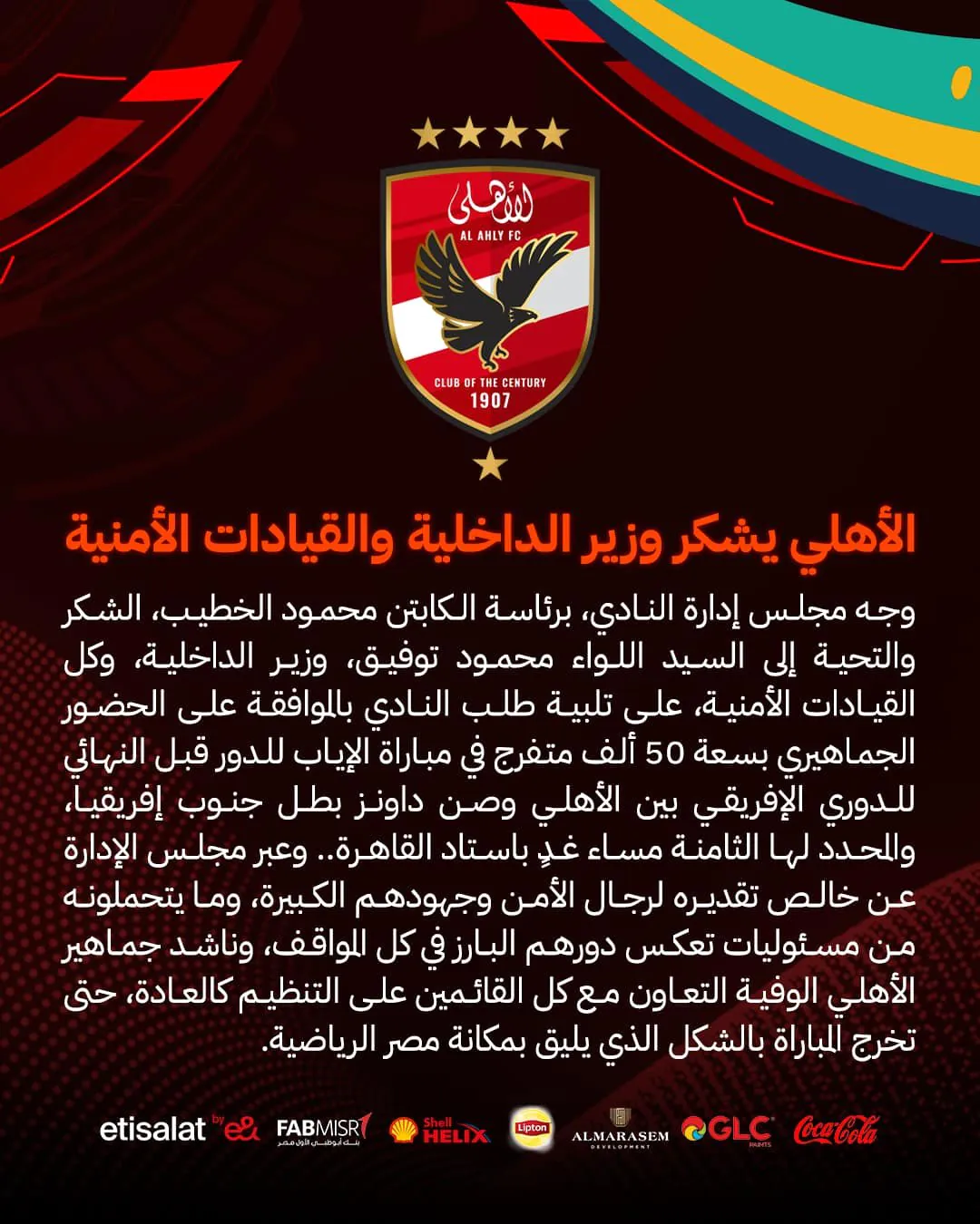 الأهلي: الموافقة على الحضور الجماهيري بالسعة الكاملة خلال لقاء “صن داونز”
