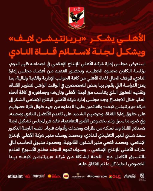 أعلن النادي الأهلي تشكيل لجنة لاستلام قناة النادي، موجها الشكر لبريزنتيشن لايف.