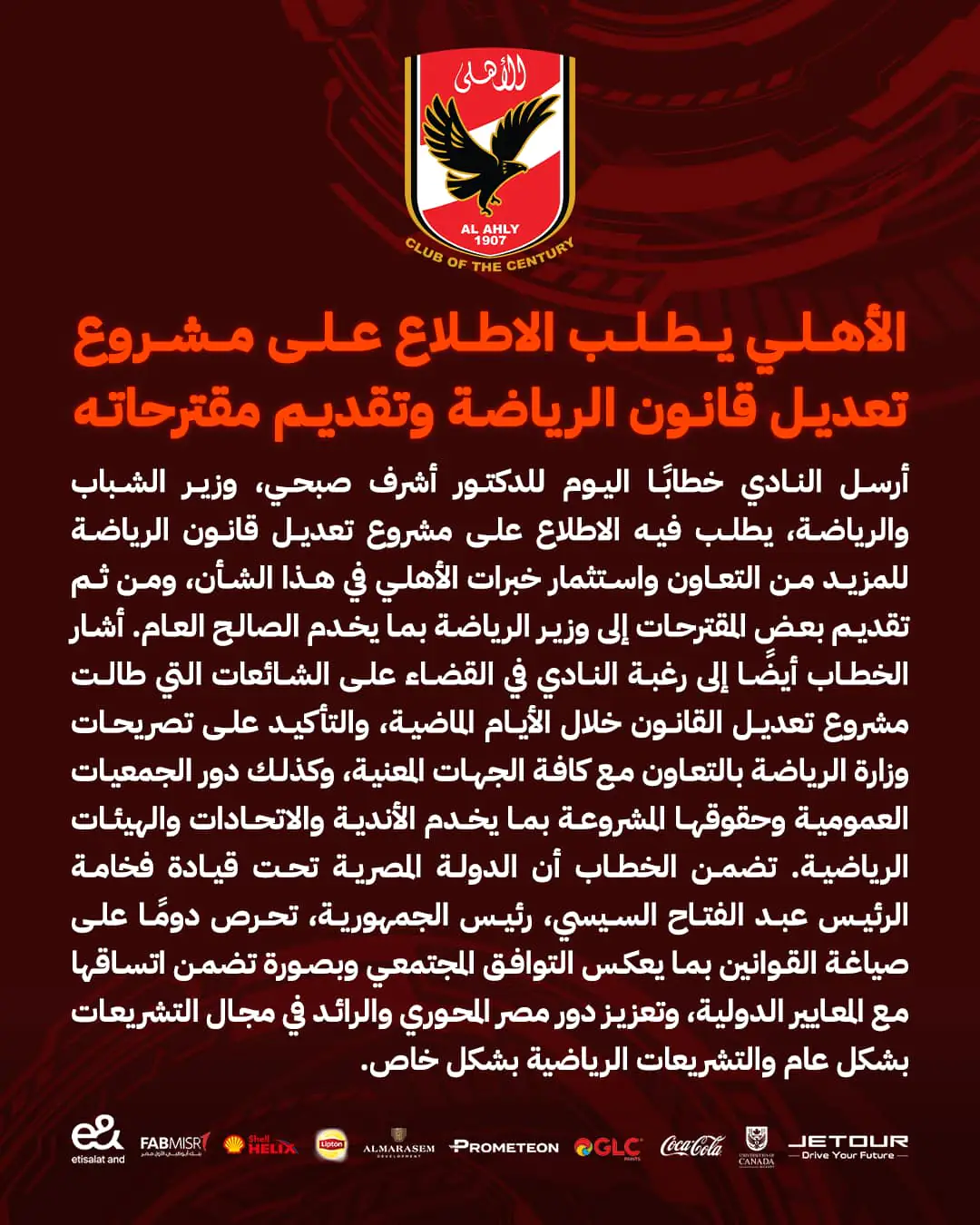 الأهلي يطلب الاطلاع على مشروع تعديل قانون الرياضة وتقديم مقترحاته