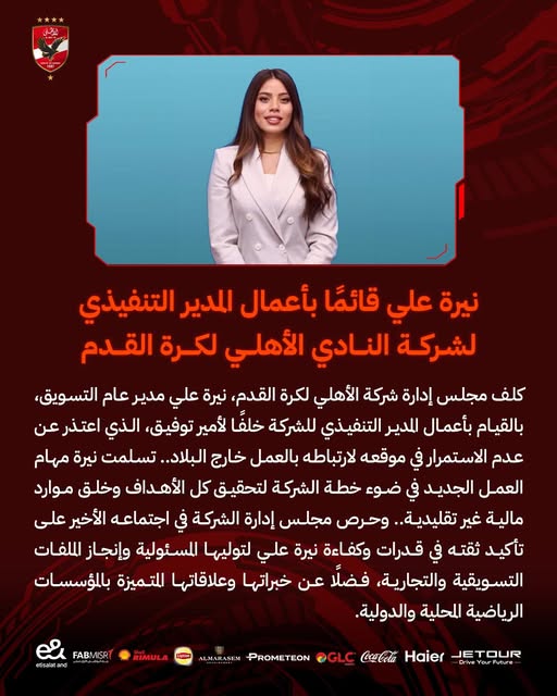 وقد بدأت نيرة علي بالفعل في تسلم مهام منصبها الجديد، وسط دعم كامل من مجلس الإدارة، الذي يسعى إلى تعزيز دور الشركة في دعم الفريق الأول لكرة القدم، وتحقيق نقلة نوعية في الأنشطة التسويقية والتجارية خلال المرحلة المقبلة.