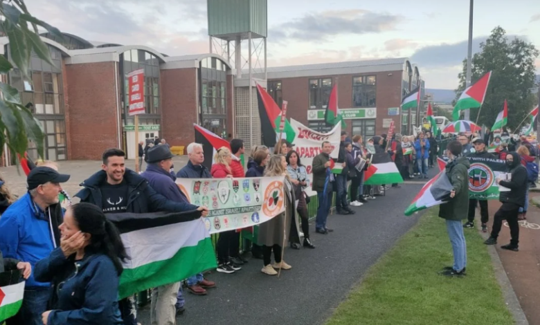 تظاهر عشرات الأشخاص في محيط ملعب «تلاجت» قرب العاصمة الأيرلندية دبلن، رافعين الأعلام الفلسطينية، قبل انطلاق مباراة لكرة القدم بين منتخبي أيرلندا والكيان الصهيوني تحت 21 عامًا.