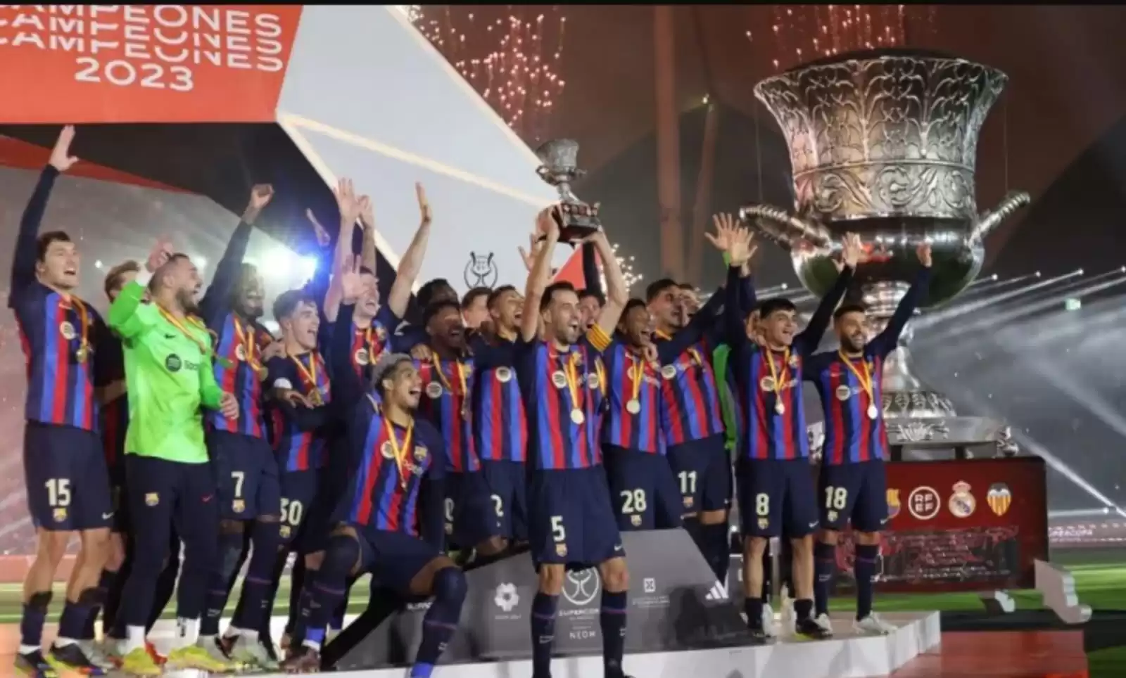 ونجح فريق برشلونة في تحقيق الفوز على غريمه ريال مدريد، والتتويج بلقب كأس السوبر الإسباني، في المباراة التي أقيمت أمس على ملعب الملك فهد الدولي بالرياض. وتوج برشلونة بكأس السوبر الإسباني. بعد فوزه 3-1 بأهداف سجلها كل من جافي وليفاندوفسكي، بالإضافة إلى بيدري، فيما سجل بنزيما هدف ريال مدريد الوحيد قبل نهاية المباراة.