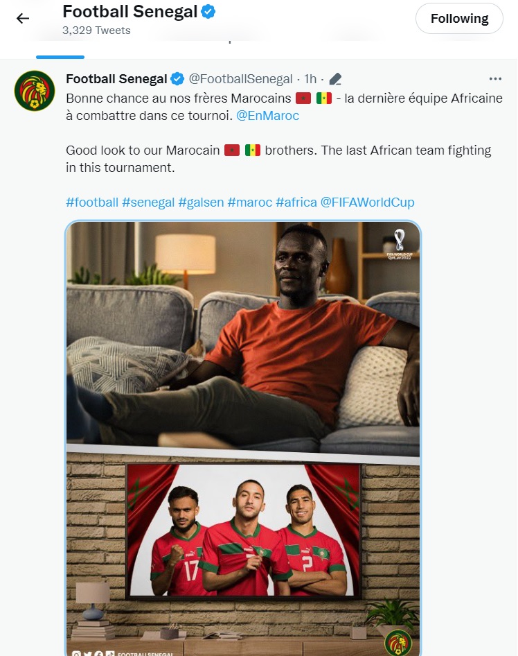 كما نشر الحساب الرسمي للاتحاد السنغالي صورة لنجم أسود التيرنجا ساديو ماني وكأنه يشاهد التلفاز مع صورة أخرى لبعض لاعبي أسود الأطلس بقميص المغرب بكأس العالم.