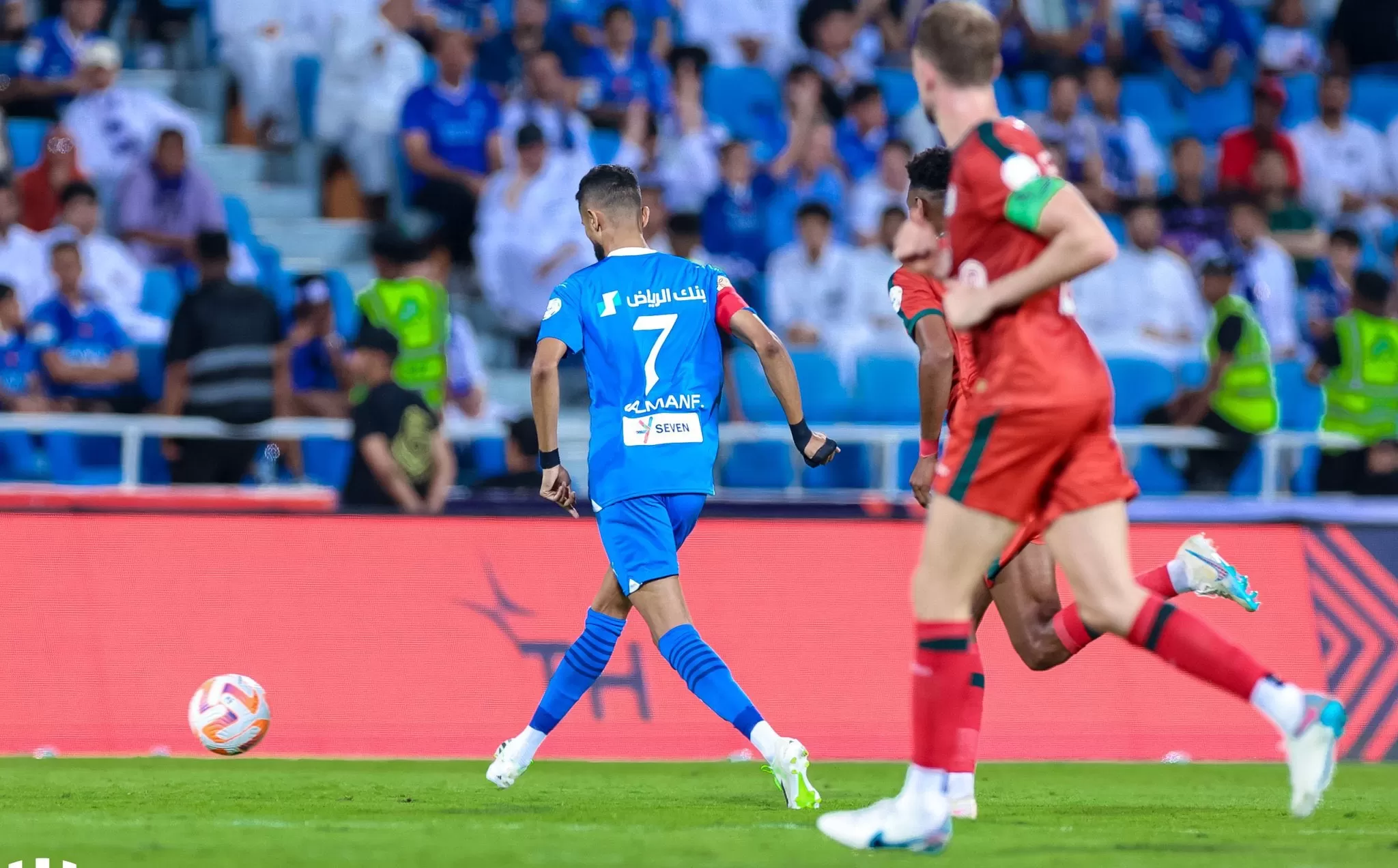 ووضع البرازيلي مالكوم مهاجم الهلال فريقه في المقدمة من تسديدة أرضية زاحفة عند الدقيقة الرابعة والعشرين، احتاج البرازيلي رامون أباتي حكم الساحة إلى الاستعانة بحكم الفيديو للتأكد من صحته، قبل أن يضاعف سالم الدوسري النتيجة بهدف ثاني عند الدقيقة الحادية والأربعين، لينتهي الشوط الأول بتقدم أصحاب الأرض بثنائية نظيفة.