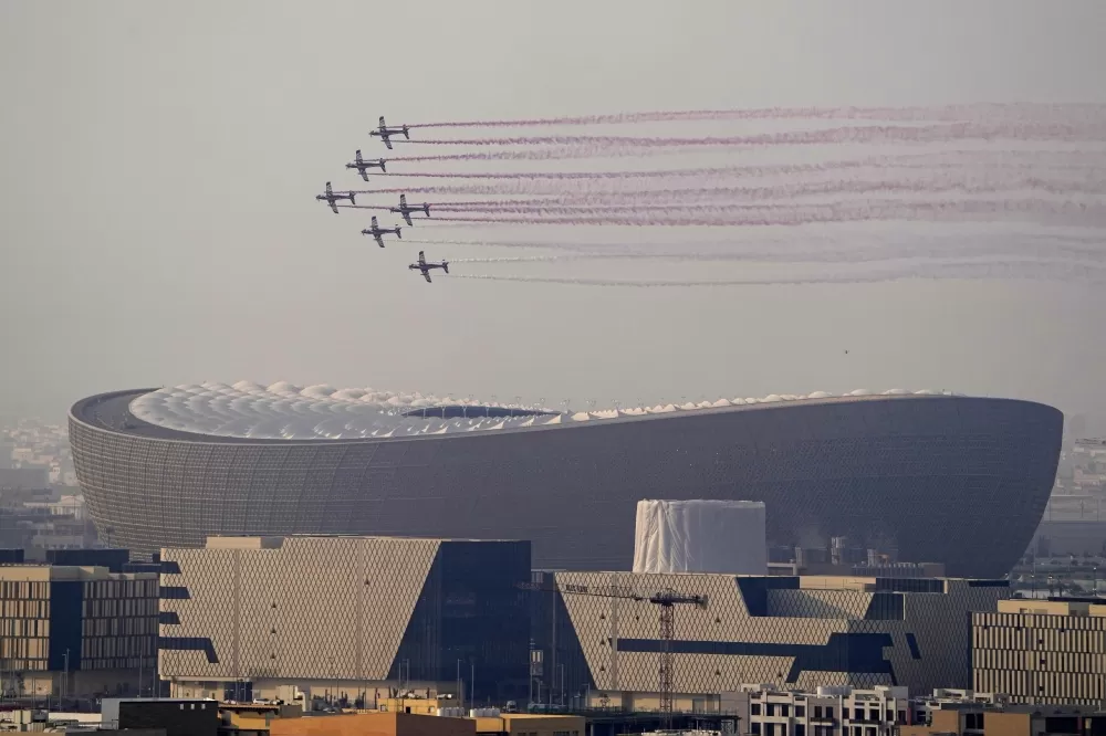 ففي الوقت الذي تتجه فيه الجماهير نحو الاستاد، وسط هتافاتها وغنائها وتشجيع فريقها بحماس منقطع النظير، تلهب عروض الطيران الأجواء بعروض رائعة حازت على إعجاب الجميع، كل ذلك جاء على أنغام أغاني المونديال، والأغاني الشعبية والتراثية والوطنية القطرية.