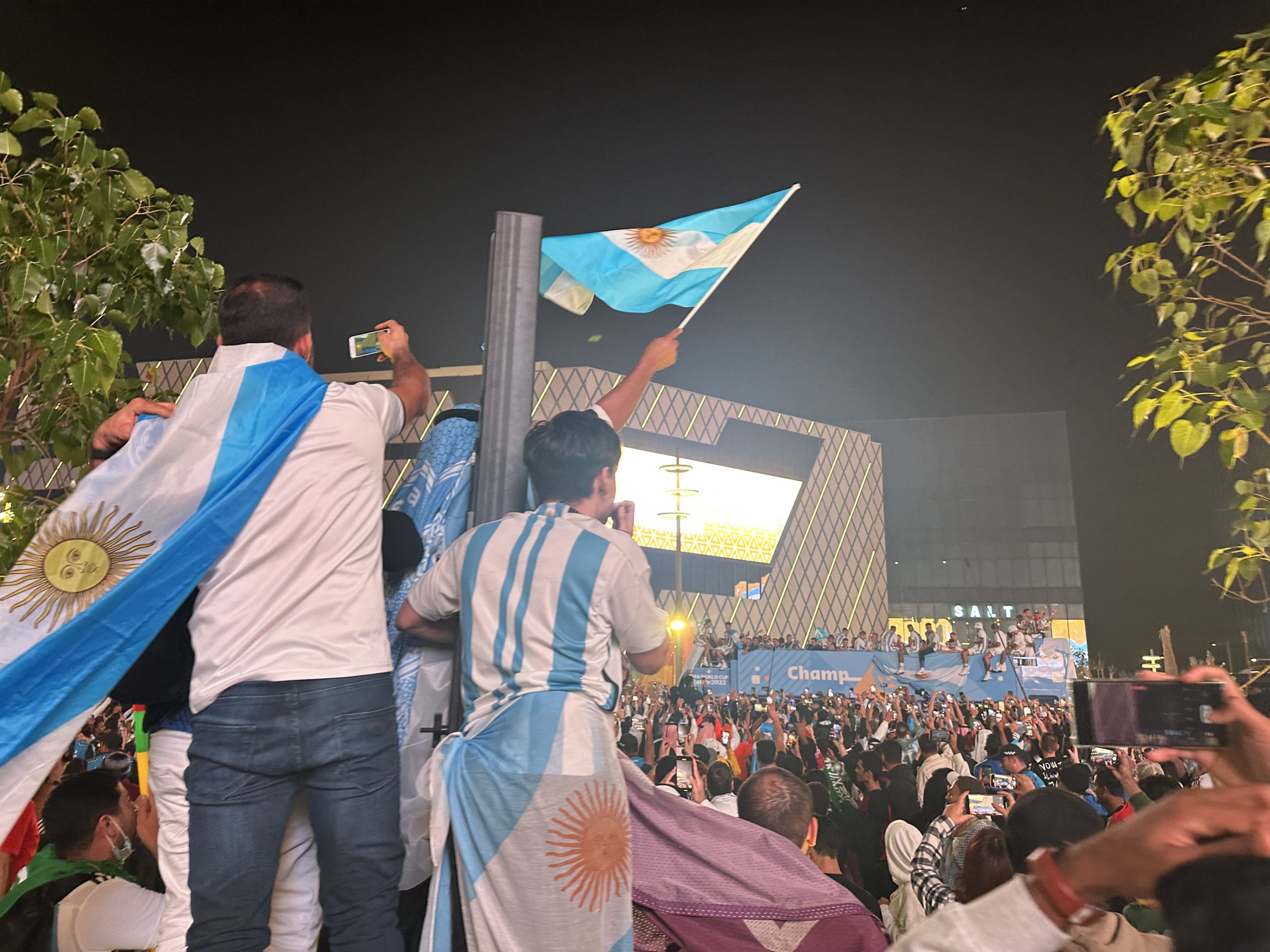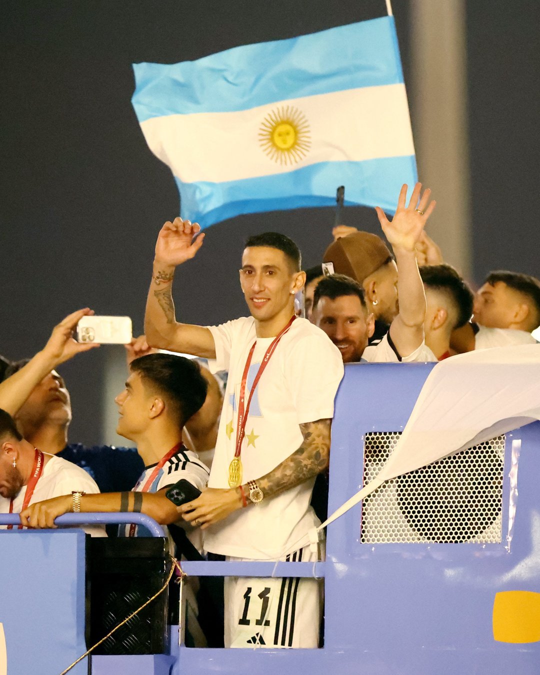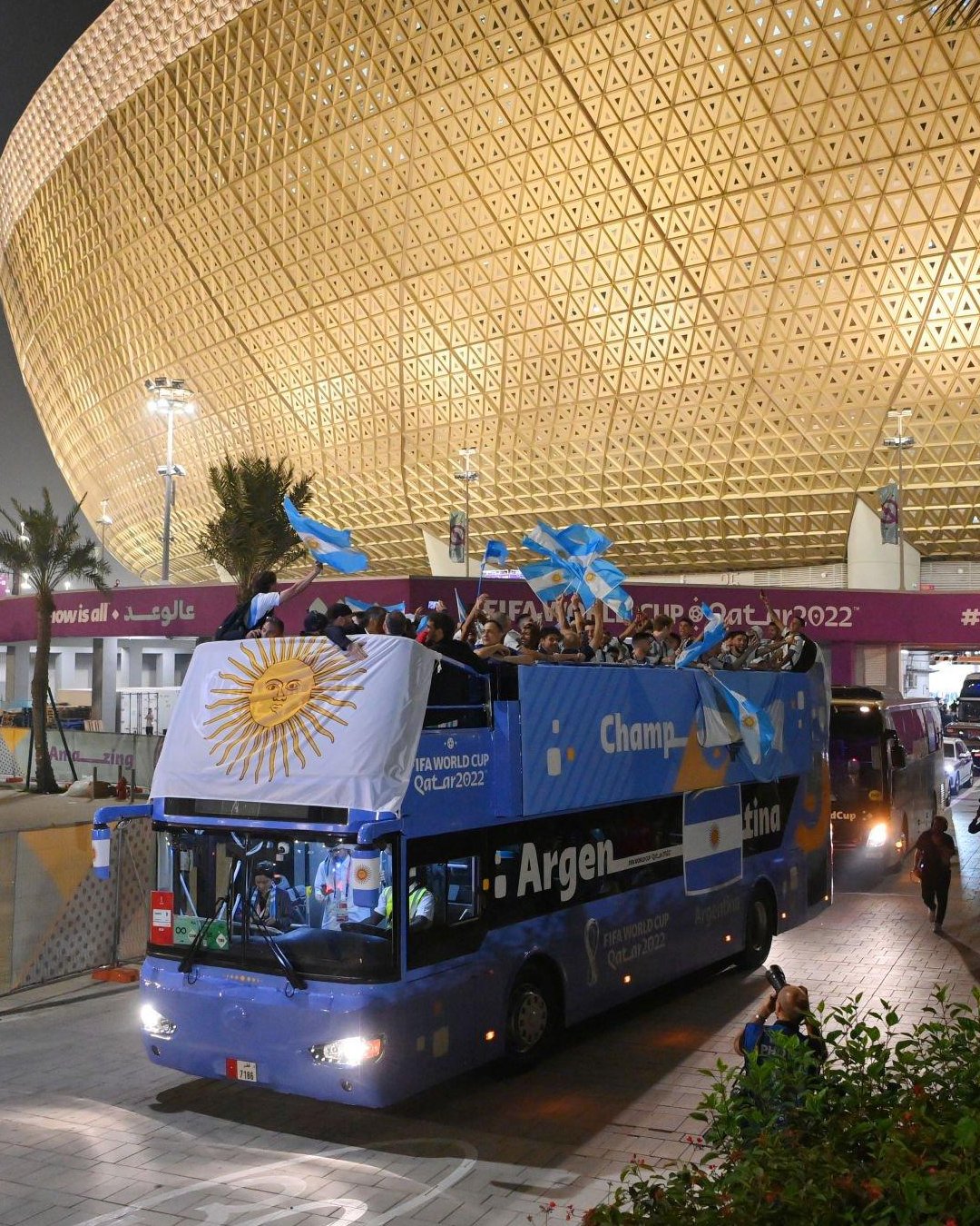 فبعد انتهاء اللقاء واحتفالات ميسي ورفاقه في أرض الملعب ومع الجماهير في المدرجات، وجدوا في انتظارهم حافلة مكشوفة مرت بهم وسط الجماهير في درب لوسيل، وظهر أبطال العالم يحملون كأس البطولة وهم يحتفلون مع الجماهير من كافة الجنسيات في بادرة هي الأولى من نوعها.