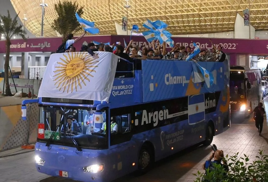 فبعد انتهاء اللقاء واحتفالات ميسي ورفاقه في أرض الملعب ومع الجماهير في المدرجات، وجدوا في انتظارهم حافلة مكشوفة مرت بهم وسط الجماهير في درب لوسيل، وظهر أبطال العالم يحملون كأس البطولة وهم يحتفلون مع الجماهير من كافة الجنسيات في بادرة هي الأولى من نوعها.
