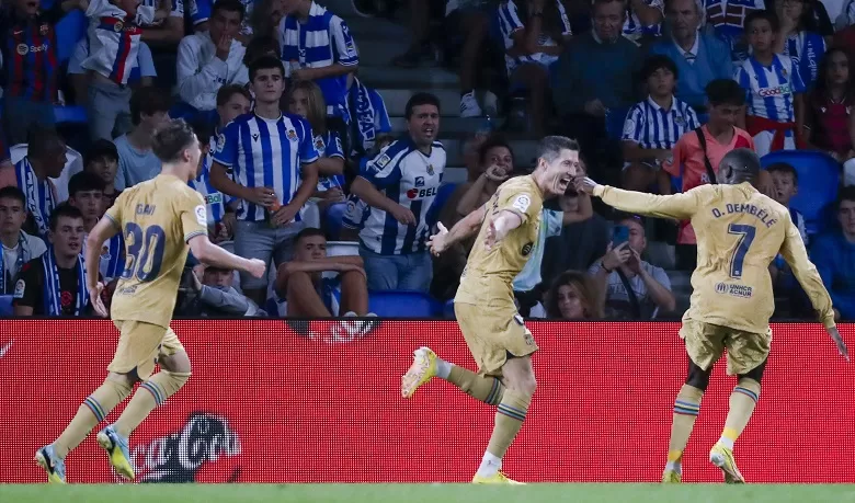 تمكن نادي برشلونة من تحقيق فوزه الأول في هذا الموسم في الدوري الإسباني بعد فوزه على ريال سوسيداد بأربعة أهداف مقابل هدف وحيد خارج أرضه، وبدأ النجم البولندي روبرت ليفاندوفسكي التسجيل في الدقيقة الأولى من المباراة التي استضافها ملعب أرنويتا، وافتتح رسمياً سجله التهديفي في الدوري الإسباني.