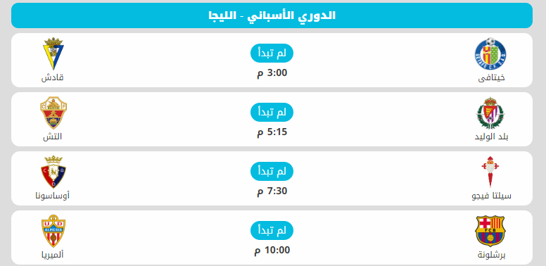 تشهد مباريات اليوم السبت بالجولة الثالثة عشرة من الدوري الإسباني لكرة القدم 4 مواجهات، حيث يلتقي خيتافي مع قادش، وبلد الوليد مع إلتشي، وسيلتا فيجو مع أوساسونا، وفي الختام يستضيف برشلونة ألميريا.
