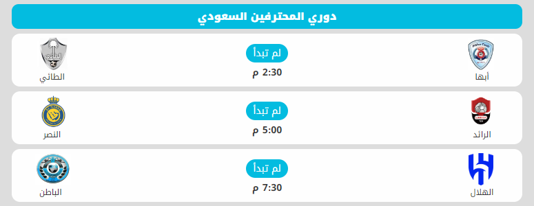 ويلتقي اليوم أيضا ضمن مباريات الجولة التاسعة من دوري المحترفين السعودي لكرة القدم، فريق النصر مع مستضيفه الرائد، ويسعى العالمي إلى تحقيق الثلاث نقاط ومزاحمة الشباب المتصدر، ويحتل النصر حاليا المركز الثالث برصيد 19 نقطة خلف الشباب والتعاون، أما الرائد فيبحث عن الخروج بأفضل نتيجة ممكنة من اللقاء حتى يحسن موقعه في جدول ترتيب البطولة حيث يحتل المركز الحادي عشر برصيد 9 نقاط، ولتقي اليوم أيضا أبها مع الطائي.