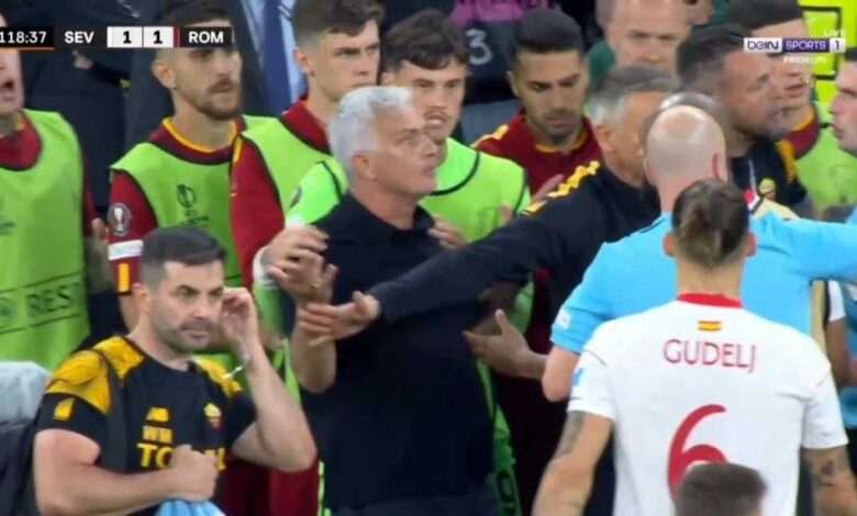 كان المدرب البرتغالي جوزيه مورينيو وجه انتقادات للحكم أنتوني تايلور في المؤتمر الصحفي عقب خسارة فريقه في النهائي القاري ضد إشبيلية، وانتشر فيديو على منصات التواصل الاجتماعي، يظهر مورينيو وهو يلوح في وجه تايلور وطاقم التحكيم، مع سماعه ينطق بكلمة “عار”.