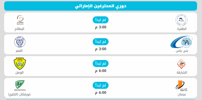 ويلتقي في اليوم نفسه الظفرة الثالث عشر برصيد 4 نقاط مع البطائح التاسع برصيد 6 نقاط، وعجمان السادس برصيد 7 نقاط مع خورفكان الحادي عشر في جدول الترتيب برصيد 4 نقاط.