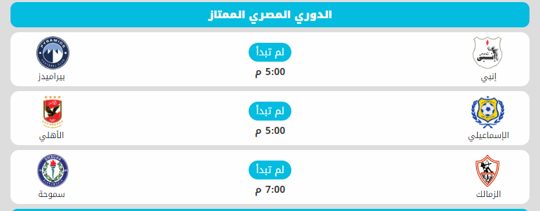تذاع مباريات اليوم الأربعاء بالدوري المصري لكرة القدم حصريا على شبكة أون تايم سبورت، مالكة حقوق بث مباريات المسابقة في الشرق الأوسط وشمال إفريقيا.
