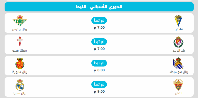 وفي نفس الجولة يلتقي اليوم أيضا قاديش على ملعبه مع ريال بيتيس، بينما يستضيف بلد الوليد سيلتا فيجو، ويحل ريال سوسيداد ضيفا على ريال مايوركا في اللقاء الذي يستضيفه ملعب أنويت.