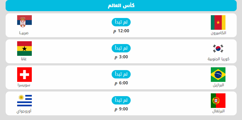 تقام اليوم الإثنين 4 مباريات في ختام منافسات الجولة الثانية للمجموعتين السابعة والثامنة للمونديال، حيث تلتقي الكاميرون مع صربيا، وكوريا الجنوبية مع غانا، والبرازيل مع سويسرا، وأخيراً البرتغال مع أوروجواي.