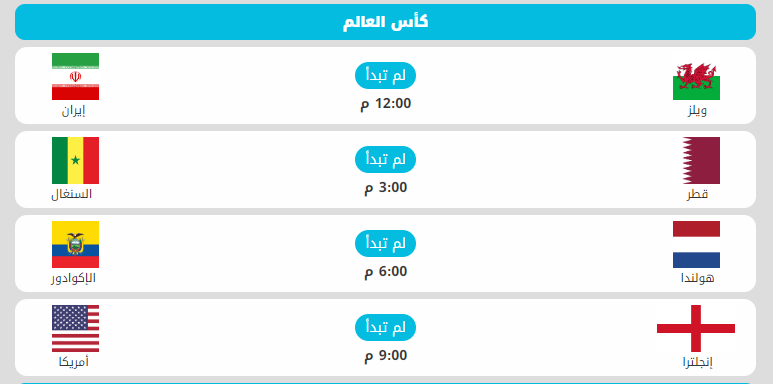 تنطلق اعتباراً اليوم الجمعة منافسات الجولة الثانية من بطولة كأس العالم 2022 التي تستضيفها قطر وتستمر حتى الثامن عشر من ديسمبر المقبل، وستشهد البداية 4 مباريات في المجموعتين الأولى والثانية، حيث تلتقي منتخبات ويلز مع إيران، وقطر مع السنغال، وهولندا مع الإكوادور، وإنجلترا مع الولايات المتحدة الأمريكية بالترتيب.