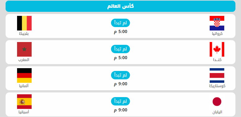 وتقام اليوم الخميس 4 مباريات في الجولة الثالثة والأخيرة للمجموعتين الخامسة والسادسة للمونديال، حيث تقام أولا مباراتي المجموعة السادسة، فيلتقي منتخب كرواتيا مع نظيره البلجيكي على استاد أحمد بن علي، وفي نفس التوقيت يلتقي منتخبا كندا مع المغرب على استاد الثمامة.