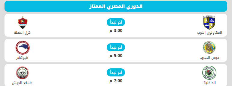 تختتم اليوم الخميس مباريات الجولة الأولى من الدوري المصري لكرة القدم الذي انطلقت منافساته أمس الأول الثلاثاء، وتواصلت اللقاءات أمس وتنتهي اليوم بثلاث مواجهات لا تقل أهمية عن السابقة، ويستضيف اليوم المقاولون العرب نادي غزل المحلة على ملعبه بالجبل الأخضر، كما يحل فيوتشر صاحب المركز الرابع ضيفا ثقيلا على حرس الحدود العائد لدوري الأضواء من جديد، كما يستضيف الداخلية الغائد للدوري الممتاز طلائع الجيش.