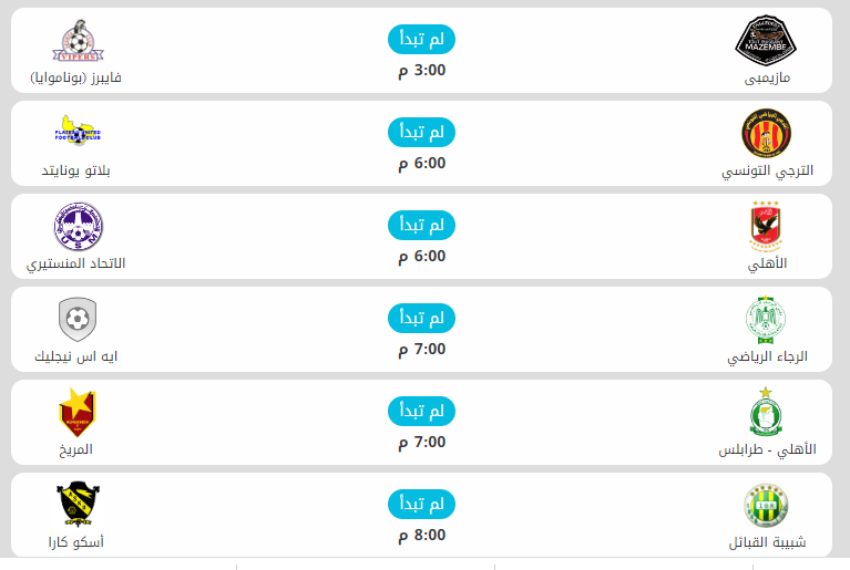 كما يستضيف الترجي نادي بلاتو يونايتد النيجيري على ملعب رادس والتي يسعى فيها الفريق التونسي تعويض هزيمته في لقاء الذهاب بهدفين مقابل هدف.