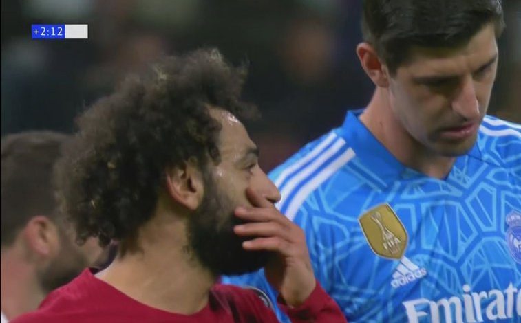 دار الحديث بين الثنائي خلال دخول لاعبي الفريقين، إلى غرفة الملابس بعد نهاية الشوط الأول من المباراة، بين محمد صلاح وتيبو كورتوا.