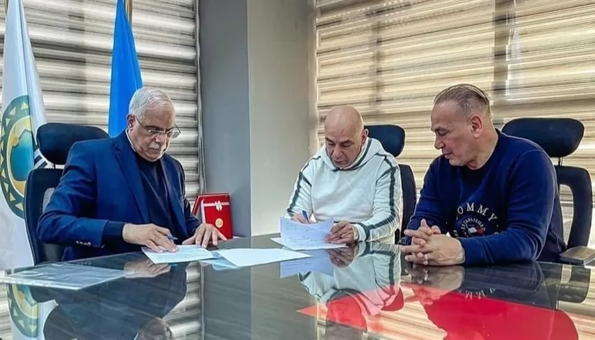 حسام وإبراهيم حسن أثناء توقيع العقود مع رئيس الاتحاد المصري