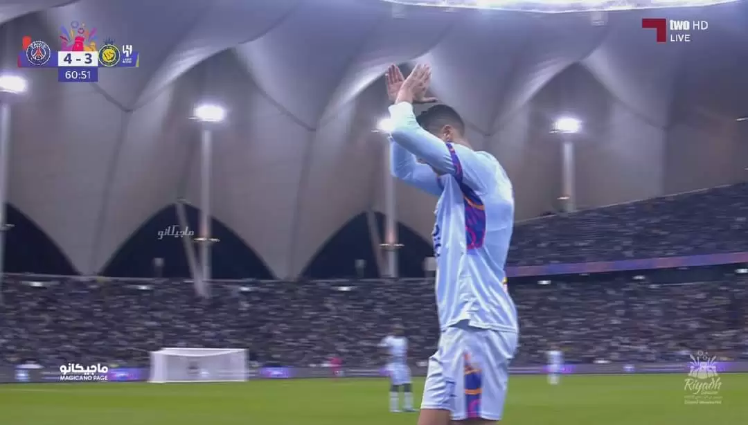 وكان رونالدو سجل هدف التعادل قبل نهاية الشوط الأول بعد رأسية ضربها لكنها اصطدمت في القائم قبل أن تعود الكرة له مجددا ويسددها في الشباك، ليعود نجوم الهلال والنصر في النتيجة بعد التأخر بسبب هدف باريس سان جيرمان الثاني عبر ماركينيوس، قبلها قد أحرز رونالدو الهدف الأول لصالح فريق نجوم الهلال والنصر، في الدقيقة 34 عبر ركلة جزاء نفذها الدون بنجاح في شباك باريس سان جيرمان
