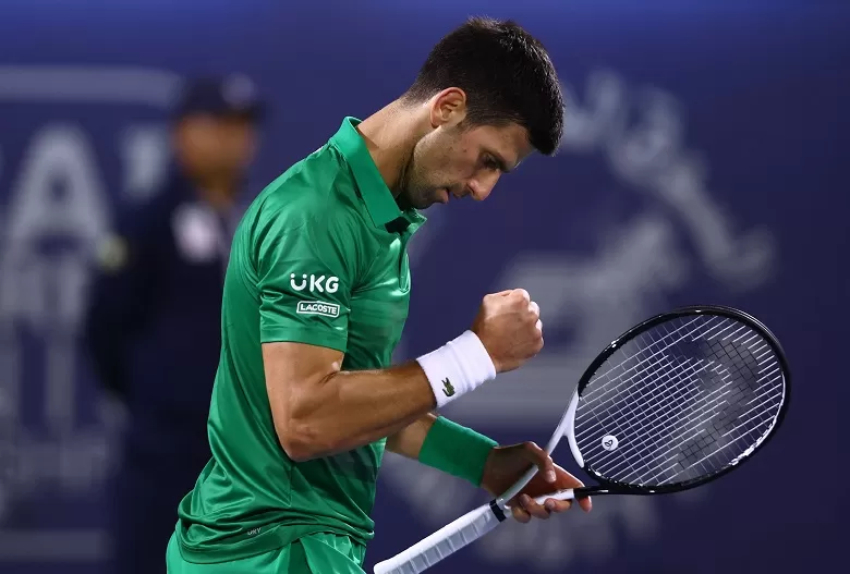 Novak Djokovic of Serbia reacts during his Men's singles match against Lorenzo Musetti of Italy at Dubai Duty Free Tennis Stadium on Feb. 21, 2022 in Dubai.