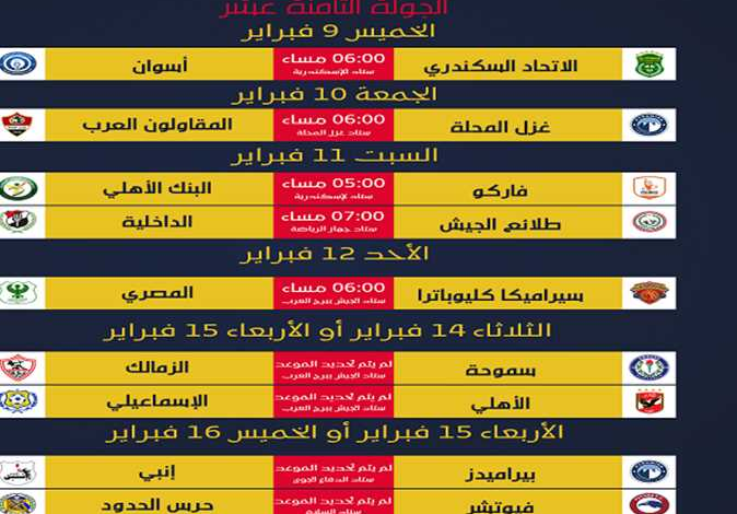 القاهرة في 6 مارس /أ ش أ/ أعلنت رابطة الأندية المصرية المحترفة، صباح اليوم الخميس، جدول مباريات الدور الثاني لبطولة الدوري الممتاز لكرة القدم، حيث سينطلق الدور الثاني بمباراة القمة بين الأهلي والزمالك يوم الثلاثاء المقبل. وأعلنت رابطة الأندية،