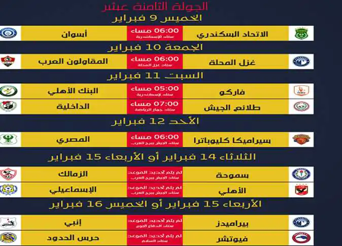 القاهرة في 6 مارس /أ ش أ/ أعلنت رابطة الأندية المصرية المحترفة، صباح اليوم الخميس، جدول مباريات الدور الثاني لبطولة الدوري الممتاز لكرة القدم، حيث سينطلق الدور الثاني بمباراة القمة بين الأهلي والزمالك يوم الثلاثاء المقبل. وأعلنت رابطة الأندية،