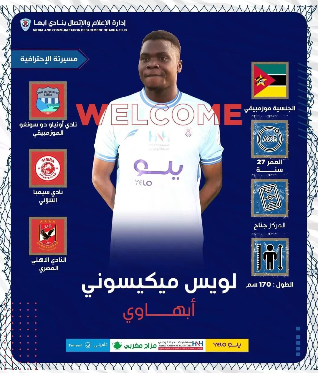 جاء البيان كالتالي:” وقعت إدارة نادي أبها عقداً احترافياً مع اللاعب الموزمبيقي لويس ميكيسوني بنظام الإعارة لمدة موسم رياضي واحد، قادماً من نادي الأهلي المصري .