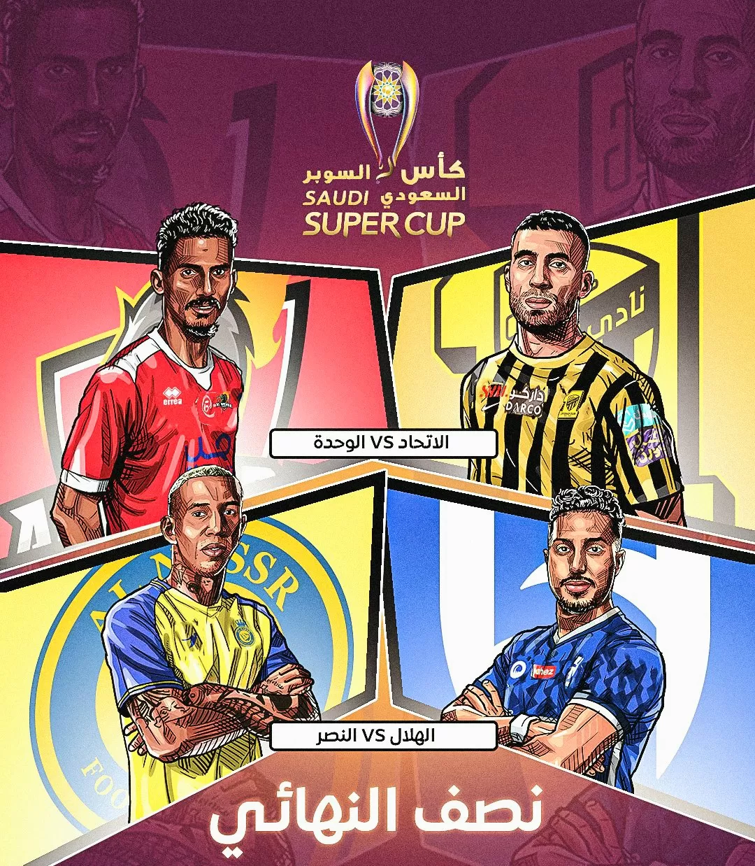 ويلتقي اتحاد جدة مع الوحدة في دور نصف النهائي، فيما يواجه النصر غريمه الهلال، في نصف النهائي.