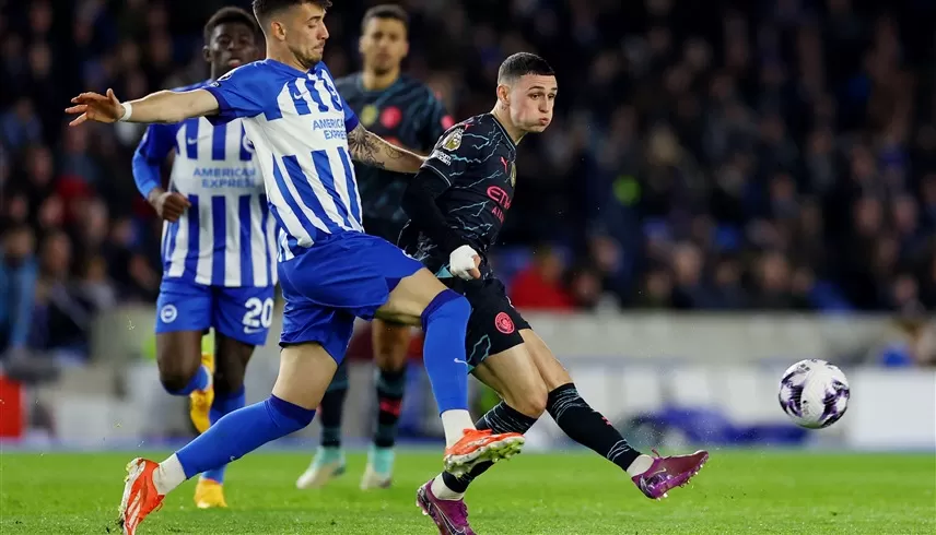 سجل فيل فودين هدفين ليعزز مانشستر سيتي سعيه لإحراز لقب الدوري الإنجليزي، للمرة الرابعة على التوالي بفوز ساحق على مضيفه برايتون آند هوف ألبيون برباعية نظيفة، في المباراة التي أقيمت بين الفريقين اليوم الخميس والمؤجلة من الجولة التاسعة والعشرين من المسابقة.