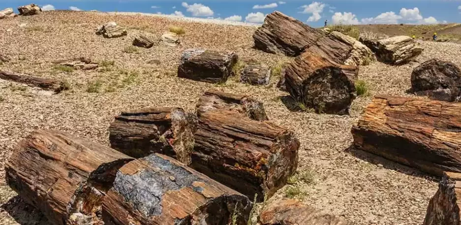 تم العثور على بقايا الخشب متناثرة على الأرض أو مدفونة جزئيًا أو كليًا بالرمال والحصى، وتكون هذه البقايا على شكل مقاطع أسطوانية يتراوح قطرها من بضعة سنتيمترات إلى عدة أمتار.