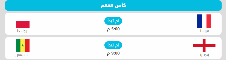 وتجمع المواجهة الثانية اليوم، منتخبي إنجلترا والسنغال، وتأهل المنتخب الإنجليزي لهذا الدور بتصدر المجموعة الثانية برصيد 7 نقاط بفوزين وتعادل وحيد، وتأهل المنتخب السنغالي لنفس الدور باحتلال المركز الثاني في المجموعة الأولى بـ 6 نقاط من انتصارين وخسارة واحدة أمام هولندا في مباراته الافتتاحية.