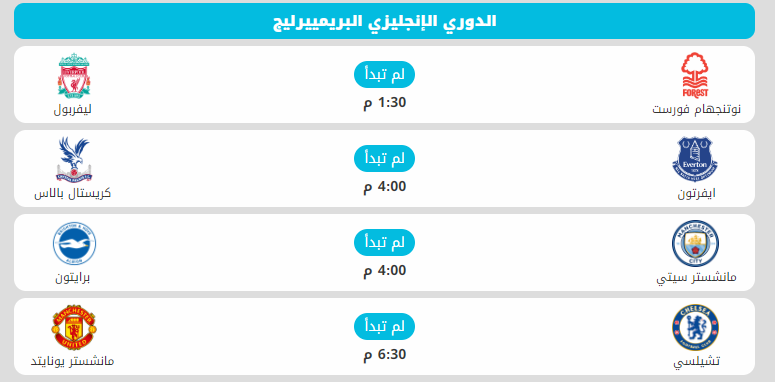 وفي باقي المباريات يحل ليفربول ضيفا ثقيلا على نوتنجهام فورست، ويستقبل إيفرتون كريستال بالاس، ويستضيف مانشستر سيتي برايتون.