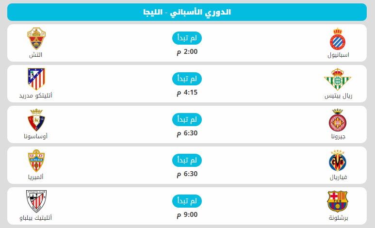 وفي باقي المباريات يحل أتليتكو مدريد ضيفا على ريال بيتيس، ويستقبل اسبانيول إليتشي، ويلتقي جيرونا بأوساسونا، ويستضيف أيضا فيا ريال ألمريا.