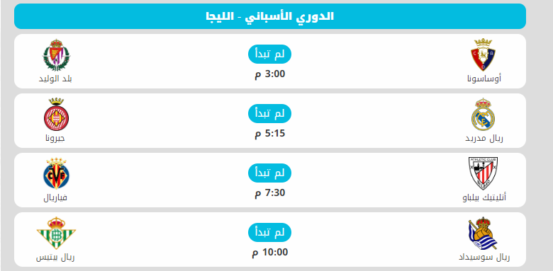 ويستضيف أوساسونا بلد الوليد، ويحل أتليتك بلباو ضيفا على فياريال، ويستقبل ريال سوسييداد ريال بيتيس، في المباراة التي تقام على ملعب أنويتا.