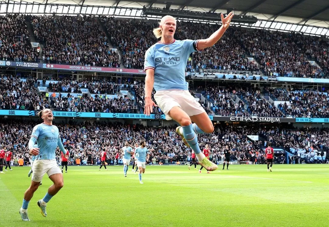 أحرز أهداف مانشستر سيتي إيرلينج هالاند (هاتريك) و فيل فودين (هاتريك)، فيما سجل أهداف مانشستر يونايتد كل من أنتوني ومارسيال (هدفين).