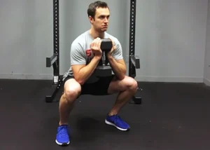 الخطوة 2: أمسك جرسًا أو دمبلًا بالقرب من صدرك بكلتا يديك.