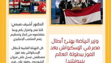 وزير الرياضة يهنئ أبطال الإسكواش تحت 23 سنة بعد التأهل لربع نهائي بطولة العالم